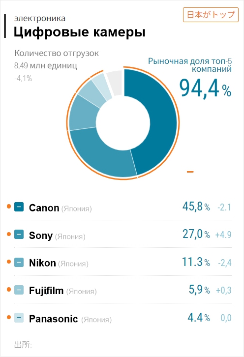 Японское аналитическое агентство Techno System Research опубликовало свой текущий отчет о продажах различных групп товаров на мировом рынке, в том числе и интересных нам цифровых камер (оранжевый кружок показывает 94,4% доли японских компаний на основе 8,49 миллионов поставленных на рынок камер). Полный отчет доступен на японском финансово-аналитическом ресурсе Nikkei:
